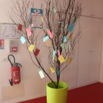 La tempête nous a fourni une grosse branche de mimosa des quatre saisons (à toute chose malheur est bon, paraît-il), que nous avons plantée dans un joli pot vert anis (disent les uns) ou jaune (disent d’autres). Nous nous sommes empressées, aidées de M. Mauvais, d’y accrocher une partie des premiers poèmes reçus, imprimés sur des papiers colorés, faits pour attirer l’œil et susciter (on l’espère) l’envie d’écrire de tous ceux qui fréquenteront la Médiathèque.